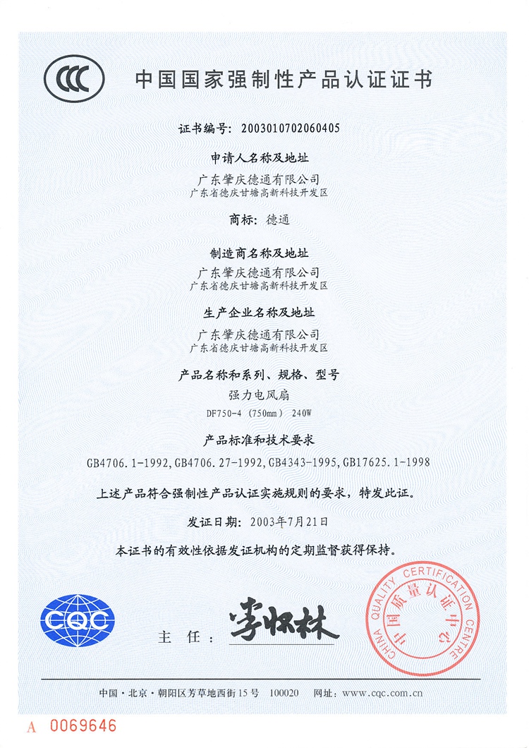 強(qiáng)力電風(fēng)扇DF750-4/3C認(rèn)證