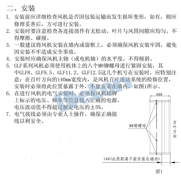 注意事項(xiàng):風(fēng)機(jī)安裝時(shí)應(yīng)注意風(fēng)機(jī)的水平位置,調(diào)整到風(fēng)機(jī)與地面水平穩(wěn)固。安裝后電機(jī)不可有傾斜現(xiàn)象