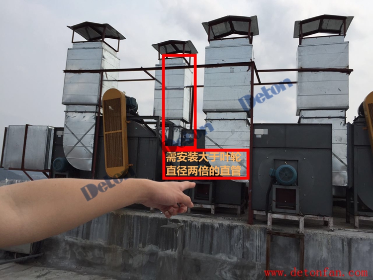 小分隊(duì)糾正:彎頭距離風(fēng)機(jī)出風(fēng)口直管的長(zhǎng)度最好是葉輪直徑2倍,但是最小不能少于1.5米,此圖需安裝直管拉開與風(fēng)機(jī)的距離。