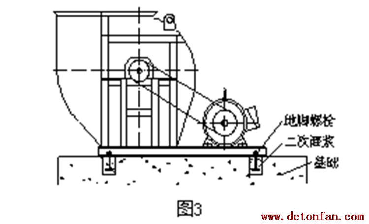 ③將風機置于基礎上,以水平儀檢查水平,可在風機底座與基礎表面之間墊上墊片來調整水平度,然后灌入水泥漿使接合面充分接觸。與此同時,在地腳螺栓預留孔內注入水泥漿,并確保地腳螺栓垂直安置。待灰漿充分硬化后,再鎖緊螺栓。(圖3)