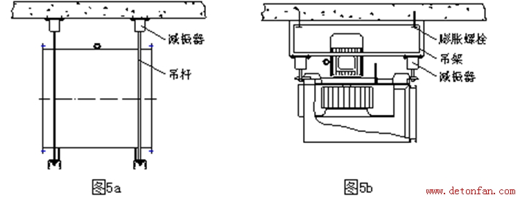 ①小型通風機可簡單地以螺桿吊掛安裝(圖5a),也可采用穩(wěn)定性更好的吊架進行安裝(圖5b)。